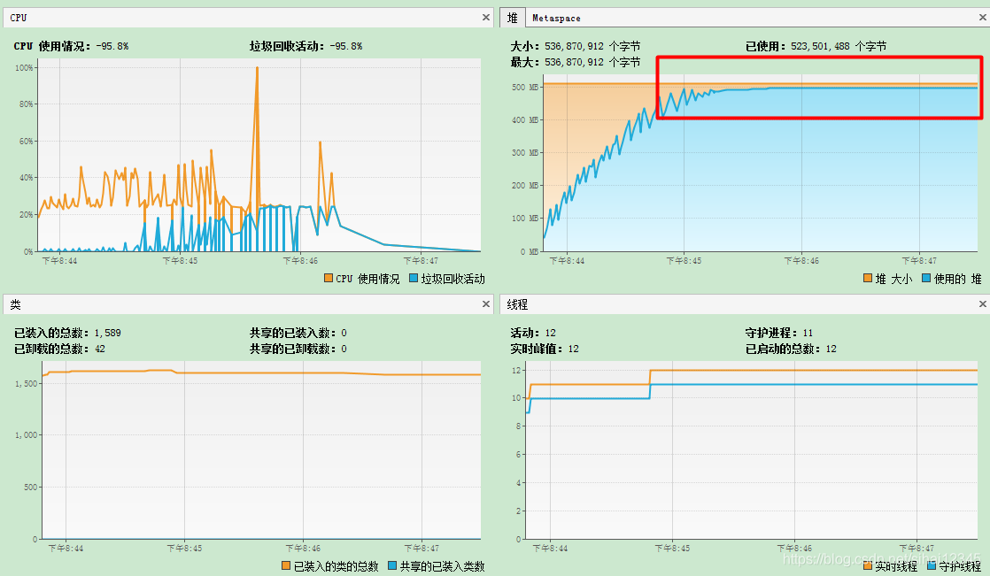 首先堆内存耗完,然后看看GC情况,设置这些参数之后,GC情况应该会不错,拭目以待。